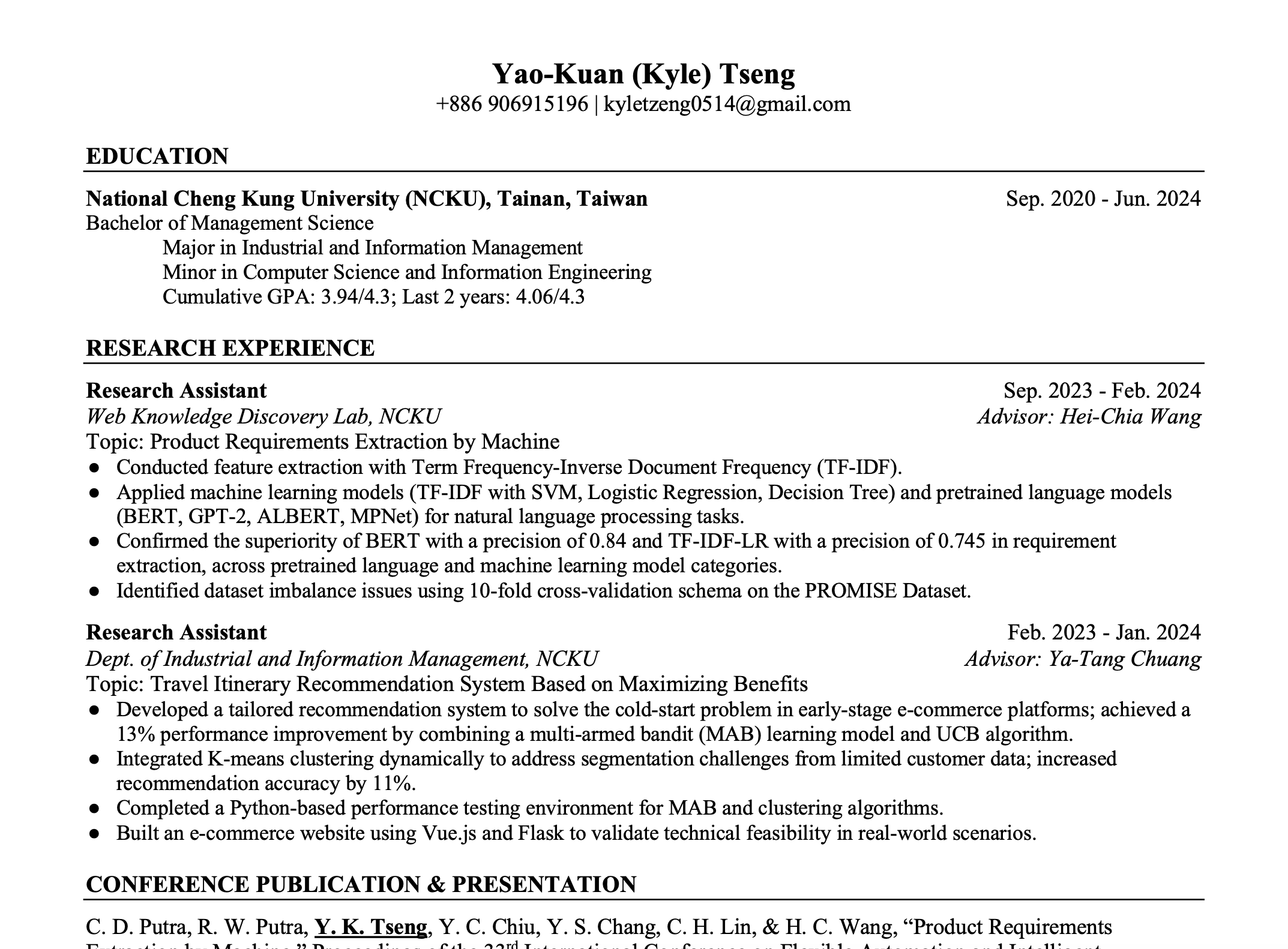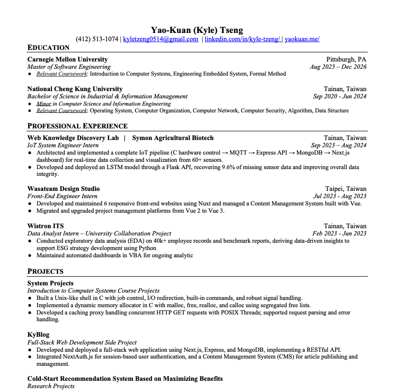 IIamamcurrentlycurrentlystudyingstudyingatatCarnegieCarnegieMellonMellonUniversity,University,wherewhereIIfocusfocusononsoftwaresoftwareengineering.engineering.InInthethepast,past,IIgainedgainedexperienceexperiencethroughthroughresearchresearchininrecommendationrecommendationsystemssystemsandandnaturalnaturallanguagelanguageprocessingprocessing(NLP),(NLP),asaswellwellasasinternshipsinternshipsinindatadataanalysisanalysisandandfront-endfront-enddevelopment.development.Additionally,Additionally,IIorganizedorganizedananindustry-academiaindustry-academiacollaborationcollaborationproject,project,helpinghelpingananagriculturalagriculturalcompanycompanybuildbuildaalow-costlow-costmonitoringmonitoringplatform.platform.